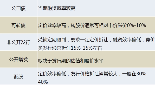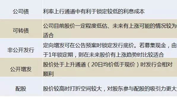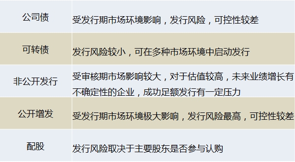 通过以上的分析,我们发现这五项融资工具各有长处,上市公司融资时具体选择哪一种,需要综合考虑自身的融资规模需求、对未来业绩增长的判断以及资本市场情况的适用性。话不多说,小编速速送上各类工具的比较总结版: